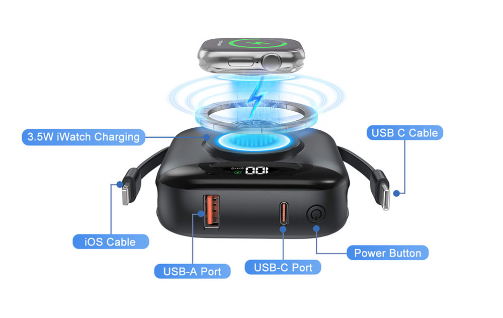 Ein integriertes Lightning-Kabel sowie ein Type-C Kabel sind seitlich im Gehäuse verstaut und jederzeit ausklappbar. Damit entfällt das lästige Mitnehmen externer Ladekabel – besonders praktisch für iPhone- und Android-Nutzer unterwegs.