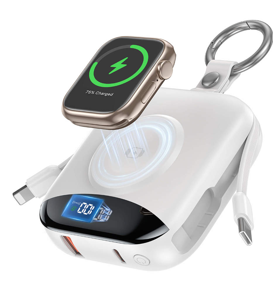 Die Orbit Powerbank bietet maximale Funktionalität auf minimalem Raum. Ausgestattet mit 10.000 mAh Kapazität, zwei integrierten Ladekabeln und einem kabellosen Ladepad für Apple Watches ist sie ein ideales All-in-One-Werkzeug für den mobilen Alltag – kompakt genug für den Schlüsselbund.