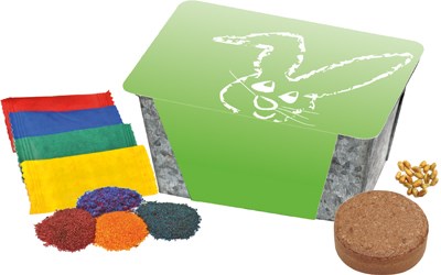 Ein komplettes Set Osterset zum Überreichen. In der Zinkwanne kann das Ostergras wachsen und mit den vier Eierfarben können die gekochten Ostereier bunt eingefärbt werden. Die umlaufende Banderole bietet ausreichend Platz für Ihre Werbebotschaft. Eine eigene Gestaltung der Banderole ist ebenfalls ab 250 Stück möglich.