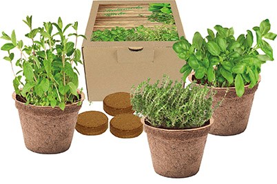 Drei ökologisch abbaubare Töpfe mit den typischen Kräutersamen für die italienische Küche: Basilikum, Majoran und Thymian. Der Werbedruck erfolgt auf dem Deckel-Etikett. Auch eine Gestaltung des Etiketts ist bereits ab 100 Stück möglich.