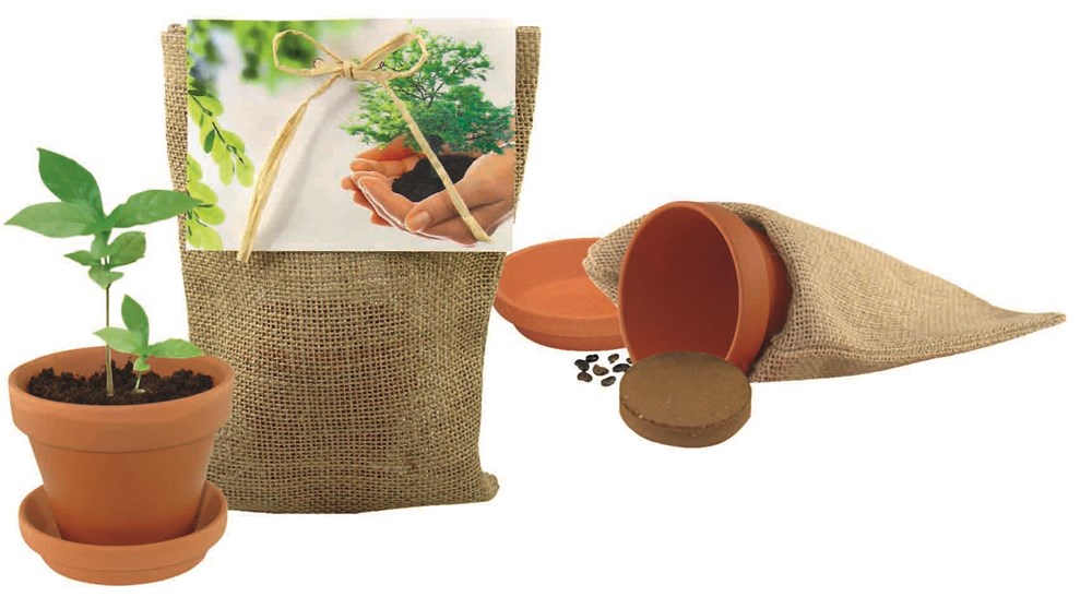 Ein Stück Natur im Jutesäckchen mit Tontopf und Unterteller, Erdtablette und Baumsamen. Die... mehr