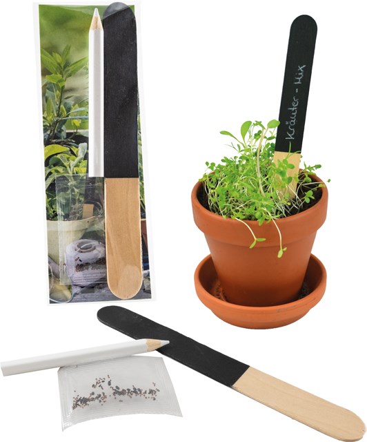 Inhalt: Holzstäbchen, Stift weiß, Samen: Kräutermischung