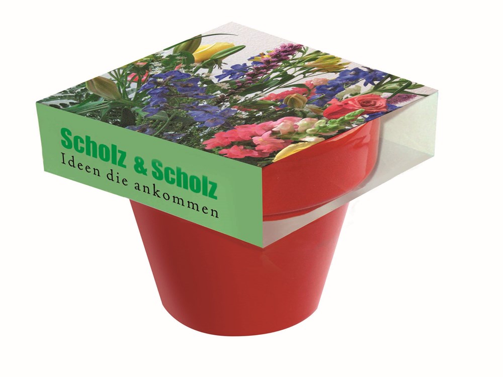 Farbenfreudig wie die Natur ist dieses lackierte Tontöpfchen. Wählen Sie Ihre Farbe aus: weiss, gelb oder rot. Die Samensorten, abgestimmt auf Ihre Werbebotschaft, sind ebenfalls wählbar. Eingelegt in dem Tontopf Colour sind Samen und Erdtablette. Die Banderole bietet Platz für den Werbeaufdruck ab 250 Stück oder aber eine eigene Gestaltung. Dafür bekommen Sie die Vorlage von uns gestellt. Eine weitere Bedruckung bietet sich direkt auf dem farbigen Topf an. Dieser transportiert sichtbar während der Wachstumsphase Ihre Botschaft. Bringen Sie Farbe in Ihr Unternehmen mit diesem sympathischen Töpfchen.